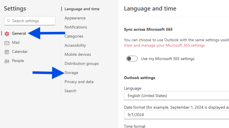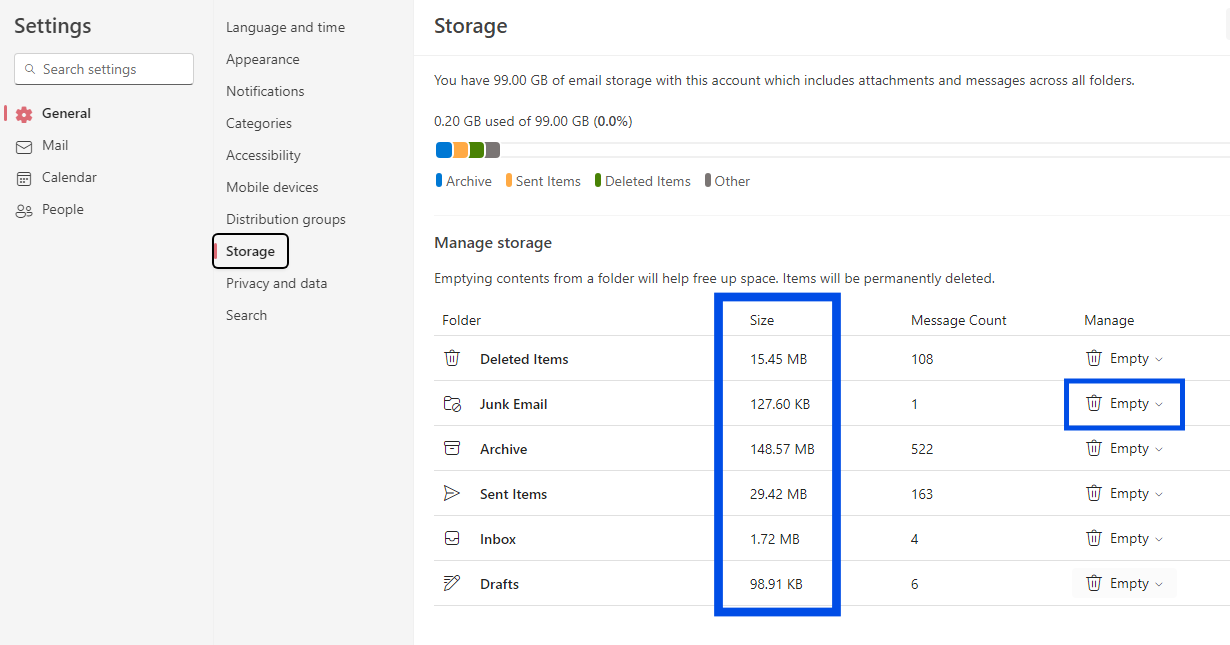 Once you have reached General > Storage you will see a breakdown of how much space each folder in your mailbox is taking.
